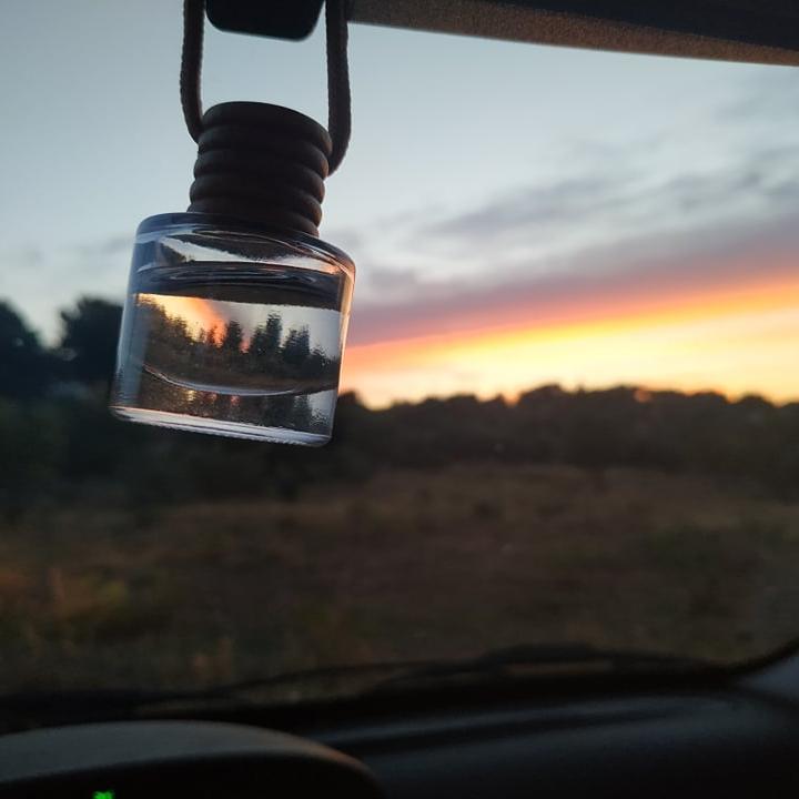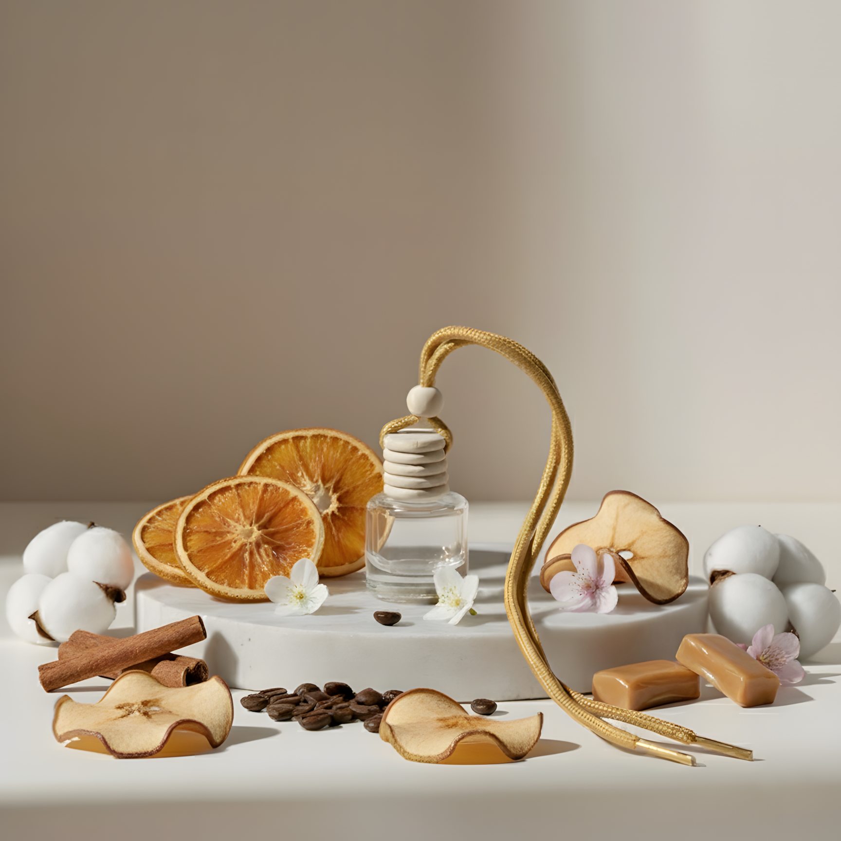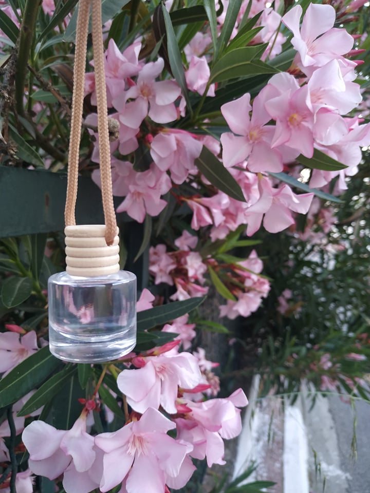 παρασκευασμένο από φυσικά αρωματικά έλαια, σε γυάλινο δοχείο, με καπάκι από ξύλο και κορδόνι για εύκολη τοποθέτηση στον καθρέφτη του αυτοκινήτου.