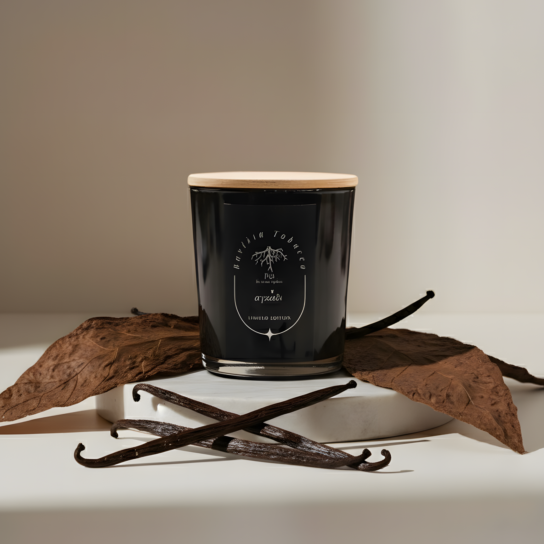 χειροποίητο αρωματικό κερί με άρωμα Vanilla Tobacco παρασκευασμένο από 100% φυτική μαλακή σόγια, με φυσικά αρωματικά έλαια, σε γυάλινο ποτήρι με ξύλινο καπάκι.