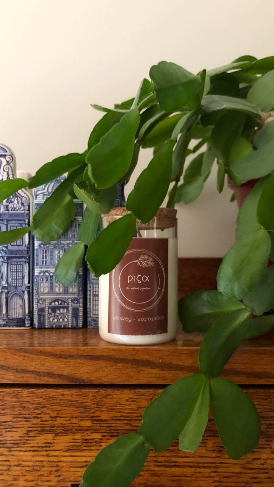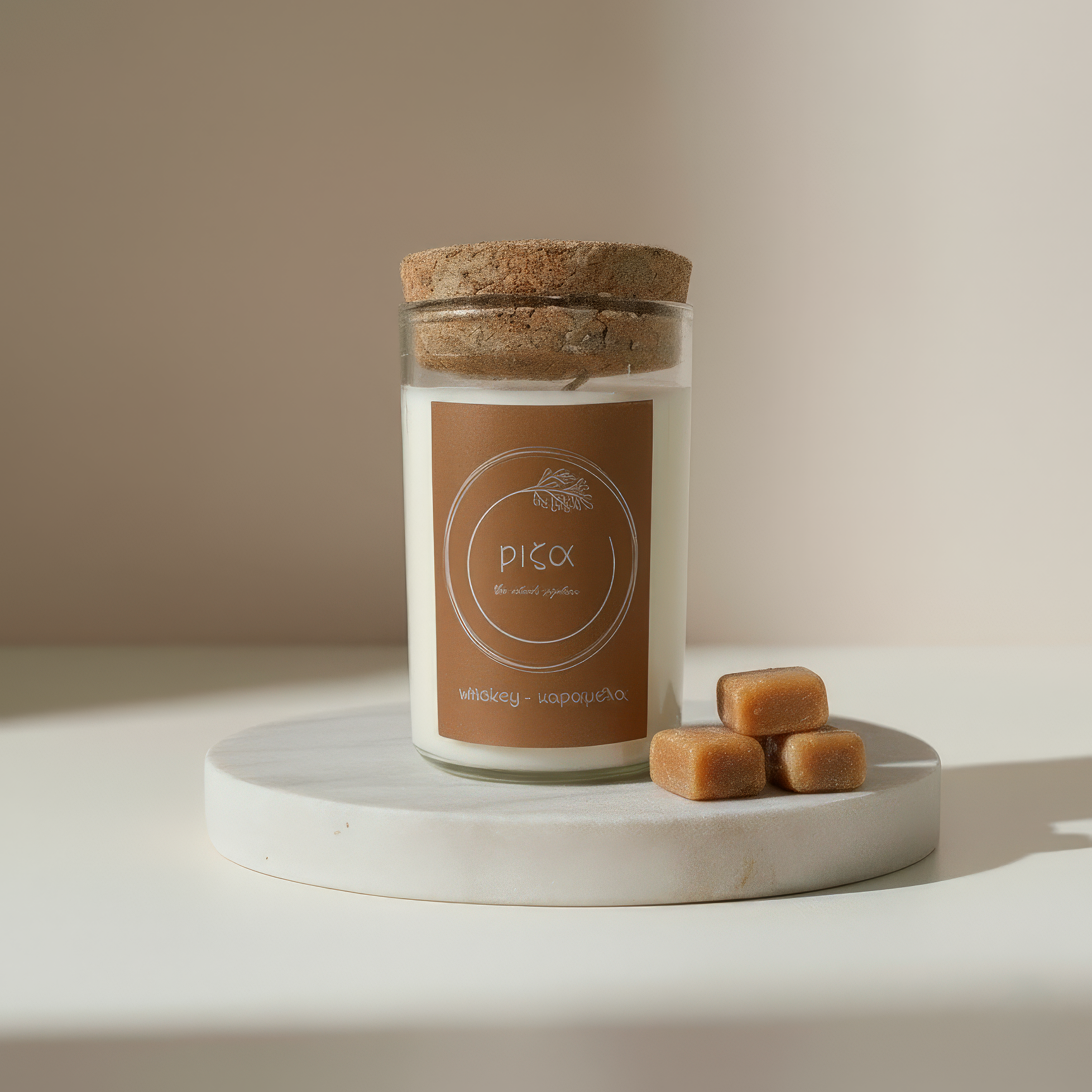 χειροποίητο αρωματικό κερί με άρωμα Whiskey Caramel παρασκευασμένο από 100% φυτική μαλακή σόγια, με φυσικά αρωματικά έλαια, σε γυάλινο ποτήρι με καπάκι από φελλό.