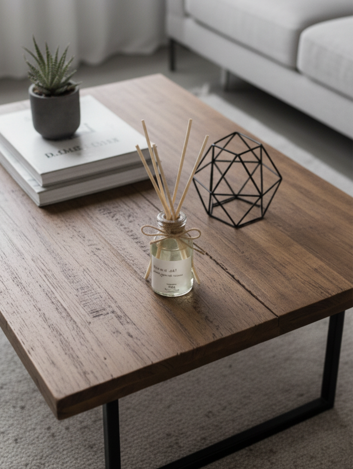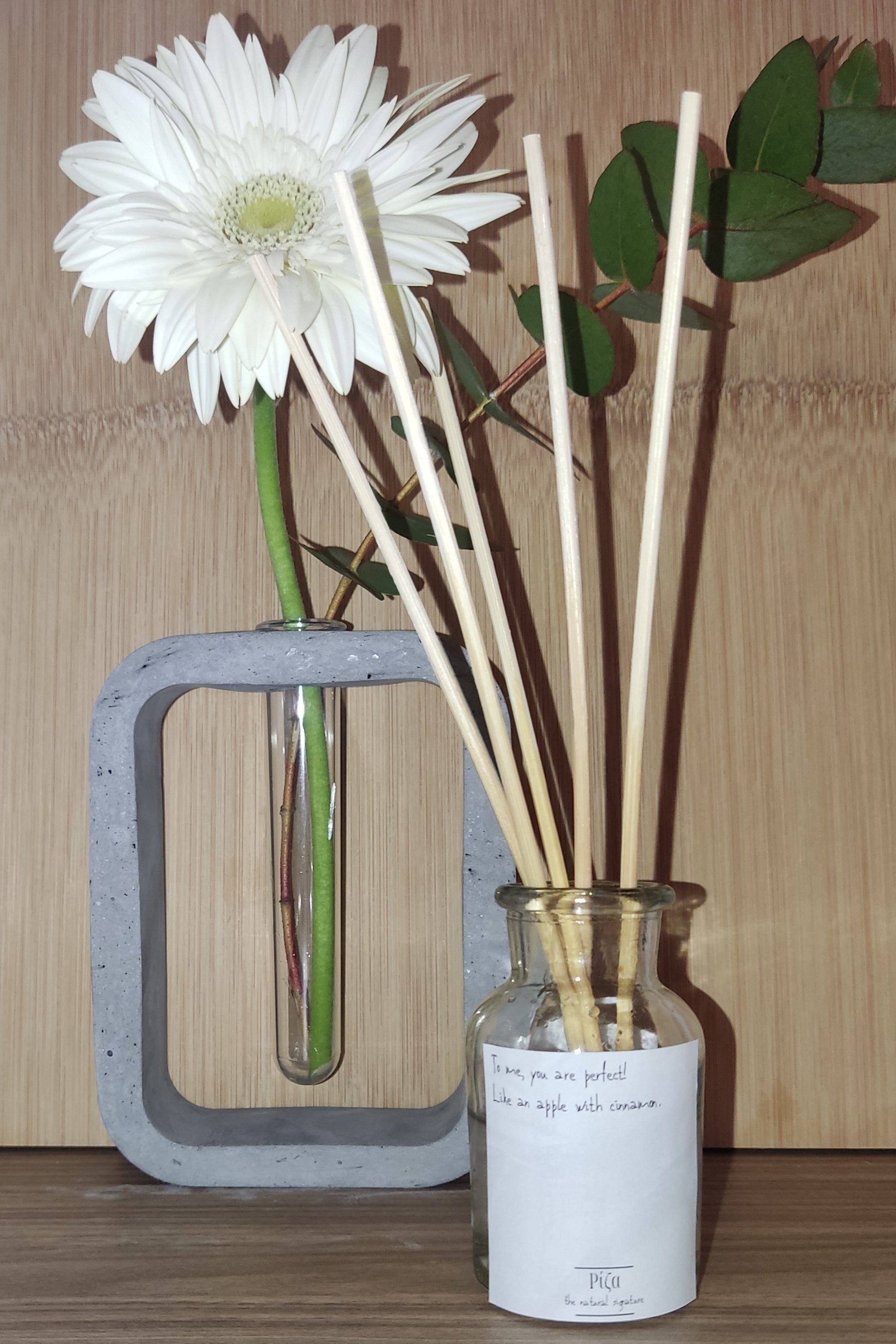 Παρασκευασμένο από φυσικά αρωματικά έλαια, σε γυάλινο δοχείο, με καπάκι από φελλό και rattan sticks.