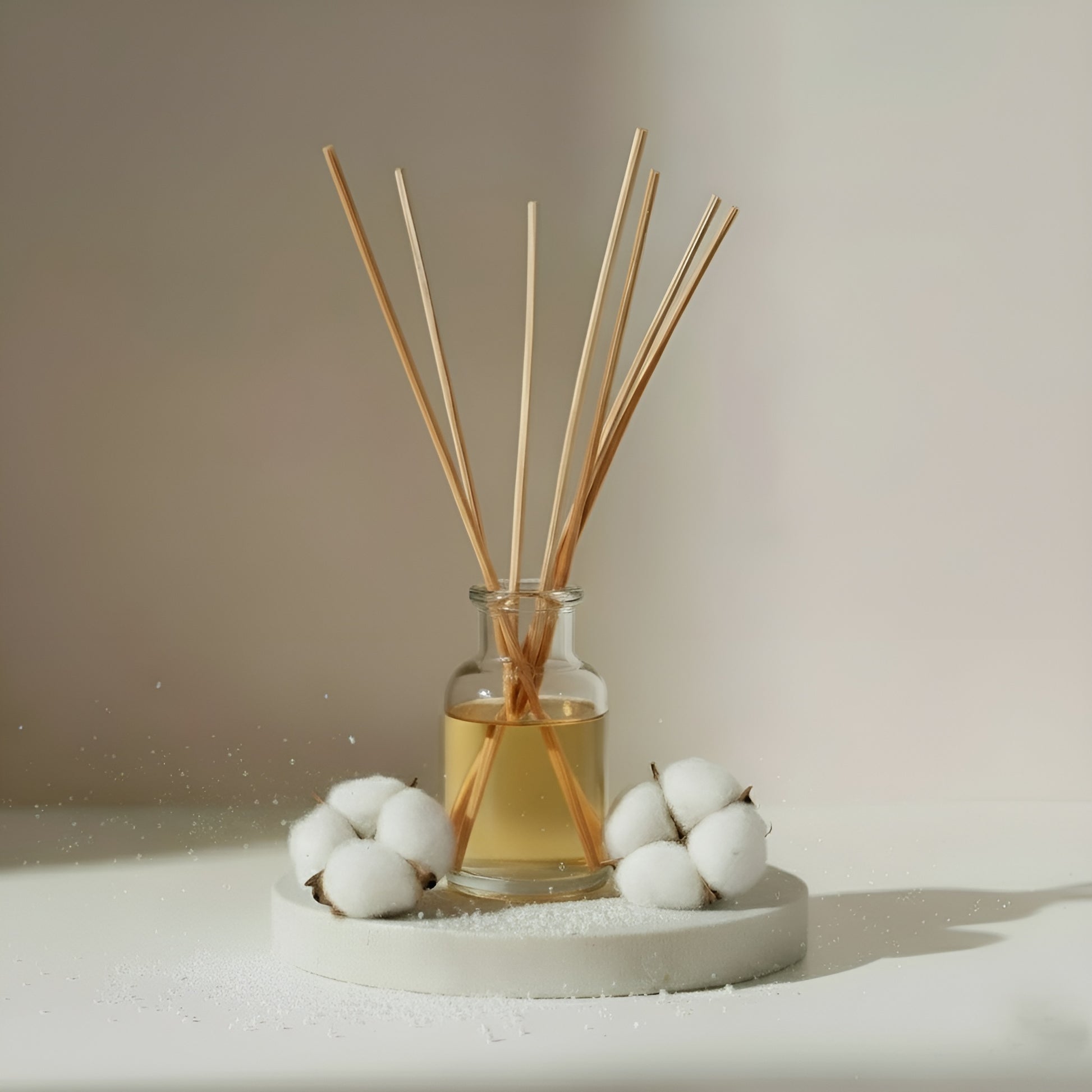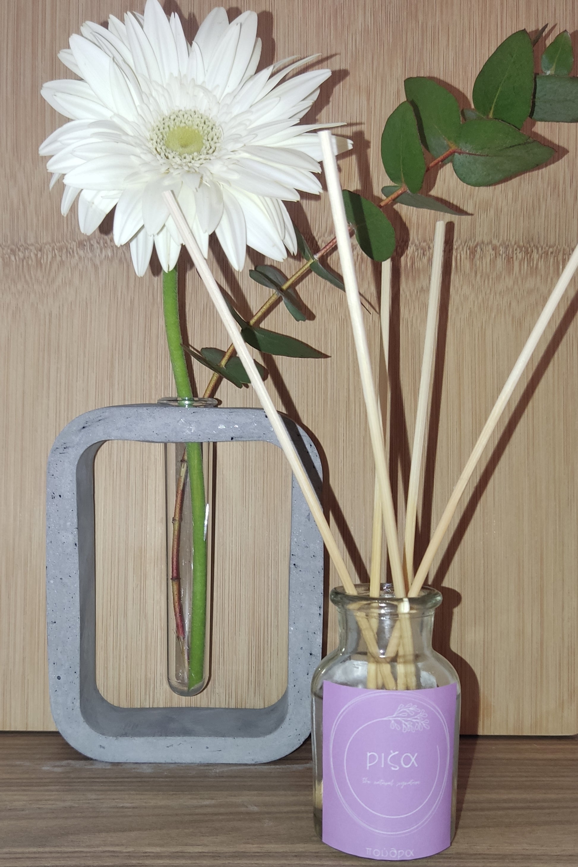 Παρασκευασμένο από φυσικά αρωματικά έλαια, σε γυάλινο δοχείο, με καπάκι από φελλό και rattan sticks.